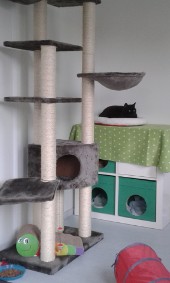 Ausgestattet wie Katzenhäuser eben sein müssen : mit vielen Kratzbäumen, Schlafplätzen und reichlich Ecken zum Wohlfühlen, Verstecken, Spielen und schmusen.